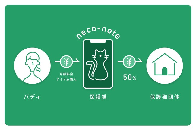バディによるサービスの利用(推し活)の課金は保護猫団体の活動費となり、団体活動を支えます。保護猫活動では、1頭あたり数万から数十万の医療費や餌代が1ヶ月でかかる場合もあります。一方で収入源を不安定な寄付に頼ってしまっているのが現状です。ここに、一定の収入が見込めることで保護猫団体の活動全体が安定し、より多くの猫を保護することができます。保護された猫が『neco-note』にデビューすることで、バディたちの推し活がもっと盛り上がり、一連の経済循環が大きく成長していきます。