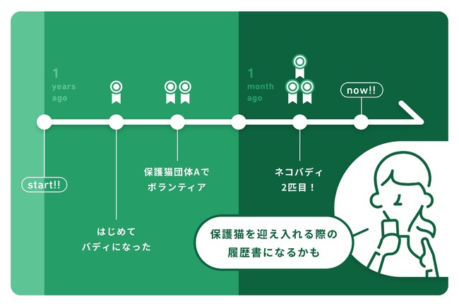 『保護ログ』は、neco-note内での保護猫活動(バディ契約やボランティアなど)の履歴データを蓄積し可視化する機能です。通常、保護猫団体は虐待などが行われないように譲渡希望者の情報を詳しく聞きますが、双方にとって負担が大きいのが課題となっています。『保護ログ』を見せることで、いつから保護猫活動に取り組んできたのかを伝えることができるので、その負担を軽減させることができます。