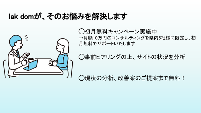 日頃よりご支援をさせて頂く企業様からもウェブ集客の必要性、自社運用だけでは限界があるというお声を頂くことが増え、同じようにお困りになられている地元滋賀県の企業様に対して少しでも価値提供が出来ればとの想いからキャンペーンを企画させて頂きました。