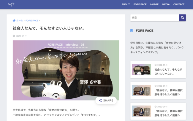 そこで、かつて同じように学生だった先輩社会人のインタビューを通して「多様な判断の仕方があっていいんだ」「自分らしい幸せの定義の仕方があるんだ」ということを伝えていくことで、少しでも不安をとりのぞき、前を向くきっかけになれないかと考えました。先輩社会人の話から、バックキャスティング的に自分の未来をフォアキャストするという意味で、この新しいメディアに『FORE FACE』という名前をつけました。