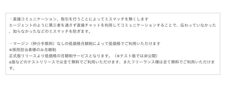 「フリーランス・副業を活用したい企業様」と「案件を探しているフリーランス」のマッチングサービスです。