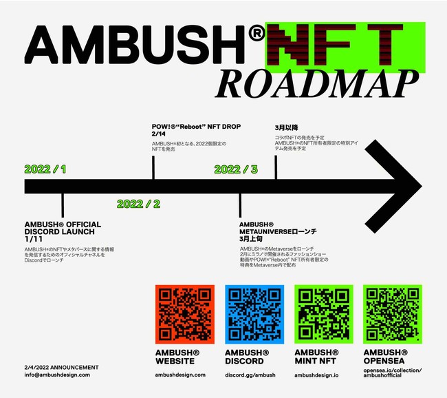 AMBUSH(R)が目指すメタバースの世界は、デジタルツールを通したブランドにとっての新たなコミュニティ創造。誰もが気軽に参加することができ、メタバース上でのブランド体験はもちろんのこと、現実世界においてのブランド体験の拡張も目指す。NFTアイテムの所有ということにとどまらず、NFTアイテムを所持していることによるオンライン、オフラインでの特典の展開などを計画。例えば、AMBUSH(R)のNFTを持っているお客様が入手できる新たなNFTや、コラボ商品などの限定アイテムが優先的に購入できるなど、言わばマイレージクラブのような特典が与えられる。ただ単にアイテムとしてのNFTを販売するのではなく、今後次世代ブランドとして躍進する第三フェーズを象徴するロードマップのスタートアイテムとしての意味合いが込められています。今後、NFTを通じたブランド体験をリアルでもデジタルでも作っていくAMBUSH(R)。今後の展開を記載したAMBUSH(R) NFTのロードマップは下記の通り。4月以降にもさまざまなNFTアイテムの発売を計画しており、発売タイミング毎に、AMBUSH(R)体験を拡張する特典やイベントを展開していく予定です。