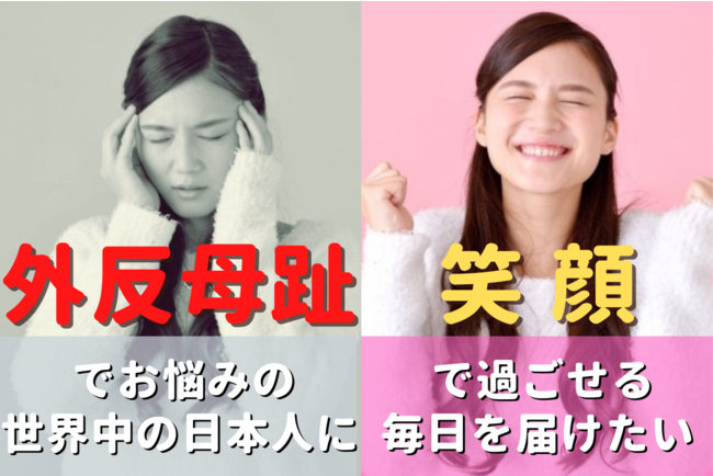 世界中の外反母趾でお悩みの日本人の方々にこのオンラインカリキュラムをご提供することで、 笑顔で過ごせる毎日を送っていただけることを実現したいと思っています。