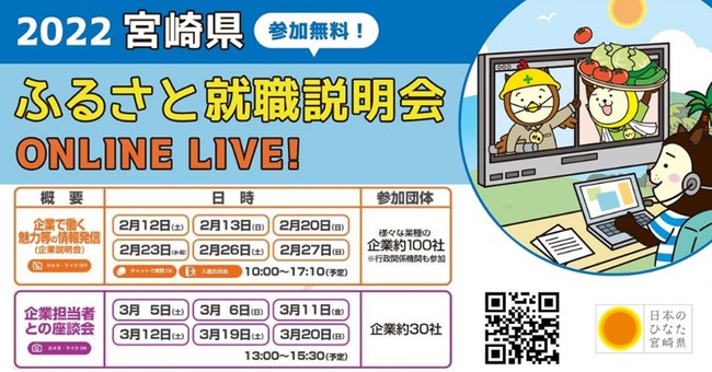 宮崎県は、宮崎県内での就職を希望される学生や一般求職者を対象とした「宮崎県ふるさと就職説明会ONLINE LIVE!」を、2月12日(土)から順次開催します。