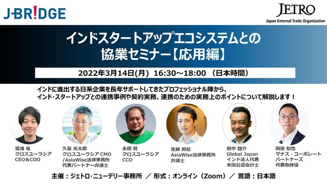 クロスユーラシアは2022年3月14日(月)に、ジェトロ主催の「インドスタートアップエコシステムとの協業セミナー【応用編】」に参加することとなりました。