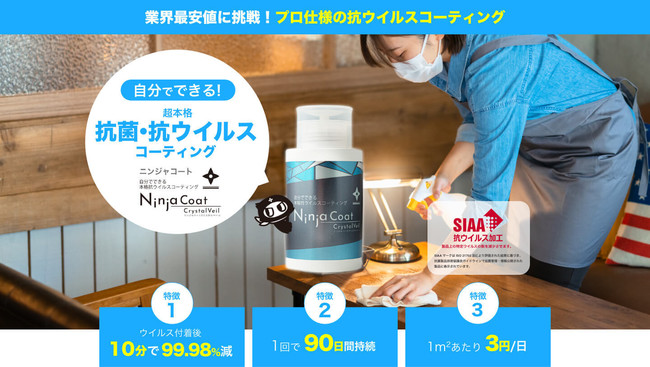 ニンジャコートは、大学や大企業の持つ最先端の抗ウイルス技術をコアに、実用性を重視し、用途に応じて一般消費者が使いやすいよう加工した抗ウイルスコーティング技術です。