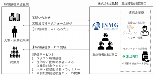 弊社では、これまで医療法人社団宗仁会と連携し、17,000人を超える方に新型コロナウイルスワクチン並びにインフルエンザワクチンの職域接種を行って参りました。今回、ブースター接種及び職域接種を希望される多くの自治体様、企業様からのご要望にお応えする形で、新たにセルスペクト株式会社との連携体制を構築し、従業員対象のウェビナー、人事・総務担当者対象の個別セミナー、中和抗体検査キット等の供給などを加えました新サービスをリリースいたします。