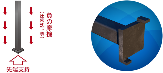 杭の先端翼部を従来の螺旋形状から平板形状にするという新発想で高支持力(先端支持力係数α=350)を実現。ネガティブフリクション対策にも有効です。