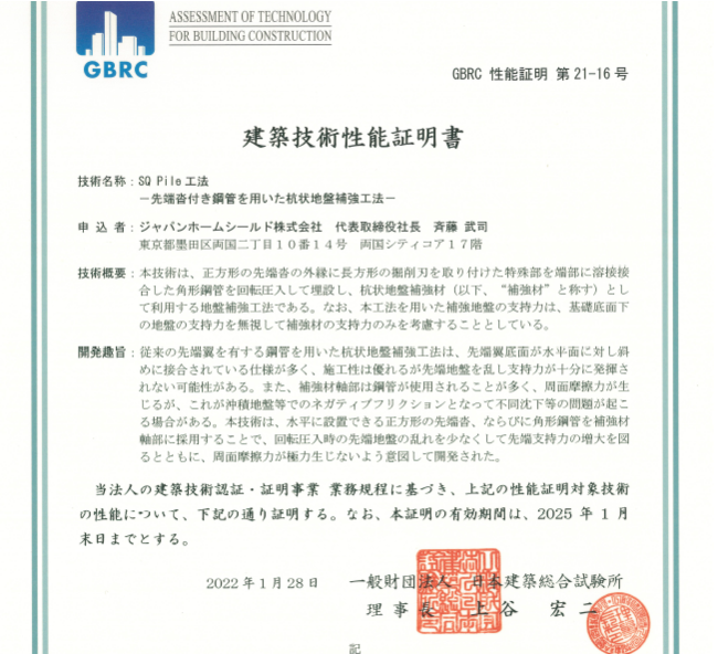 地盤調査・建物検査を行うジャパンホームシールド株式会社(所在地:東京都墨田区、代表取締役社長:斉藤武司、以下 JHS)は安全性と経済性を両立する新地盤補強工法「SQPile(R)(エスキューパイル)」を2022年4月1日に提供開始しました。