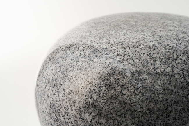 庵治石で作られた石のスツール。庵治石と聞くと墓石を思い浮かべる方も多いのではないでしょうか? 庵治石とは香川県高松市東部の牟礼町・庵治町でのみ産出される希少性の高い石で、水晶と同程度の強度が特長です。研磨すると石の表面に現れるまだら模様の光沢「斑 (ふ) 」。これは庵治石だけに見られる現象で唯一無二、その神秘的な美しさから「花崗岩のダイヤモンド」の名で世界的にも高く評価されています。