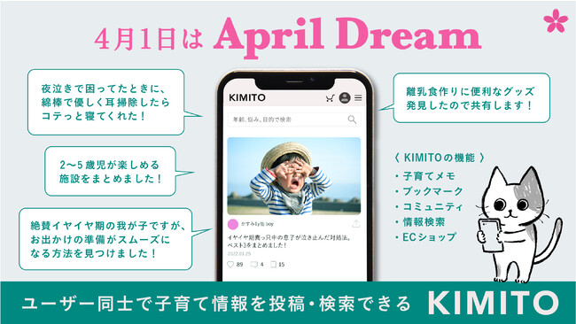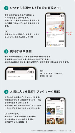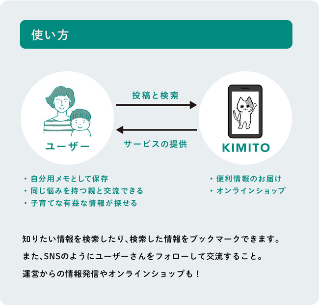 KIMITOは、そんな共働き世帯の方々に向けて、子育てに関する情報共有や交流の場を提供することで、子育てを楽しく、少しでも楽にするお手伝いをすることを目的としています。