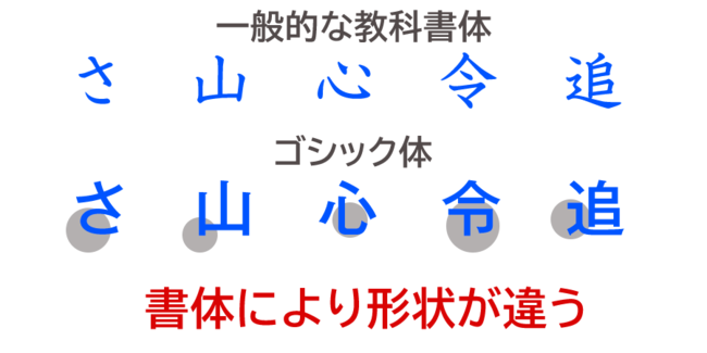 次にフォントの事例。上段の教科書体と、下段のゴシック体。 灰色の○で囲われた部分の形に注文してみて下さい。