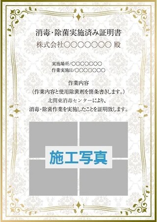 作業内容をご説明し、消毒・除菌済みステッカーをお渡しします。消毒・除菌済み証明書は、当日の消毒・除菌作業写真を添えて、後日郵送にてお届けします。