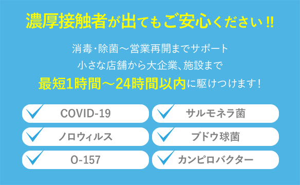 陽性者が確認され、直ぐにご連絡頂きました。翌朝から消毒作業を行い、次に日には従業員も通常通り、ご出社頂いております。素早いご決断が、会社を救います。お取引先の方にも安心して頂けること間違いありません。