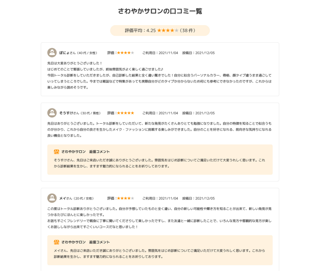 実際にサロンに行ったことのある方の口コミを見ることが出来ます。