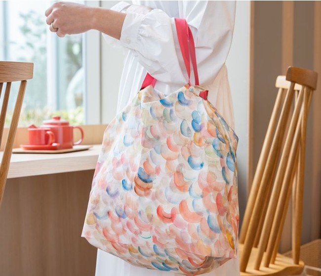 こうした新商品開発における情報収集に努めている中、福祉実験ユニット「ヘラルボニー」様の存在を知り、その想いに共感し社業を通じた社会課題の解決を目指した新商品開発においてご一緒させていただきたいと打診したところ快諾いただき、発達障がい者2名の作品のアートライセンス契約の締結に至りました。開発アイテムは「エコバッグcoconi」の第2弾、尚この商品に関しては使用済みペットボトルをリサイクルしたエコ素材を用いました。持続性撥水加工の機能も有しシワになりにくい素材でもあります。さらにこちらも環境に優しい「インクジェット捺染」で染色を行っています。