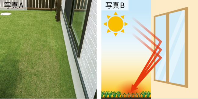 立地・気温・窓ガラスと太陽の位置関係など、さまざまな条件が揃うと高温になり、人工芝に被害を及ぼします。