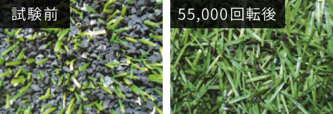 芝糸に競技用人工芝に含まれる素材を練り込み、さらに芝糸に厚みを持たせることで耐摩耗性能が向上。耐摩耗試験において、FIFA認定基準をクリアしています。