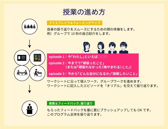 マイドキュメンタリーでは、「今『わたし』といえば○○○」など受講者が自身を振り返るための設問をエピソードと定義し、個人ワークとグループワークを通してエピソードをまとめます。その後、各自がエピソードを発表し、最後にグループ全員で授業を通じて自分たちが何を学んだかを共有します。グループの全員が話し手にも聞き手にもなり、自己を表現することと他者の発表を傾聴し意見をフィードバックすることを経験します。発表・傾聴・フィードバックを通じて自己表現力や他者を承認する力の向上を目指し、人間としての魅力に磨きをかけます。
