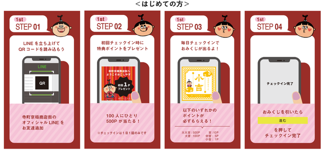 寺町京極商店街の公式アカウントをお友達追加し、QRコードを読み込めば登録が完了。チェックイン毎に小吉から大大吉までおみくじ機能でランダムにポイント付与、最大500ポイントがもらえます。