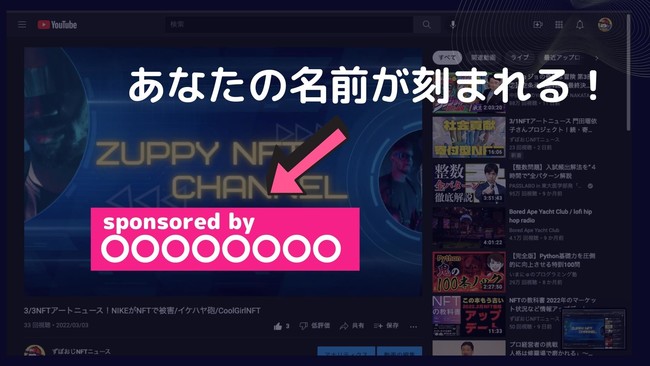 購入翌日から2週間(もしくは最低10本の動画がアップされるまで)、ずぼおじNFTチャンネルのyoutube動画にスポンサーとしてクレジット