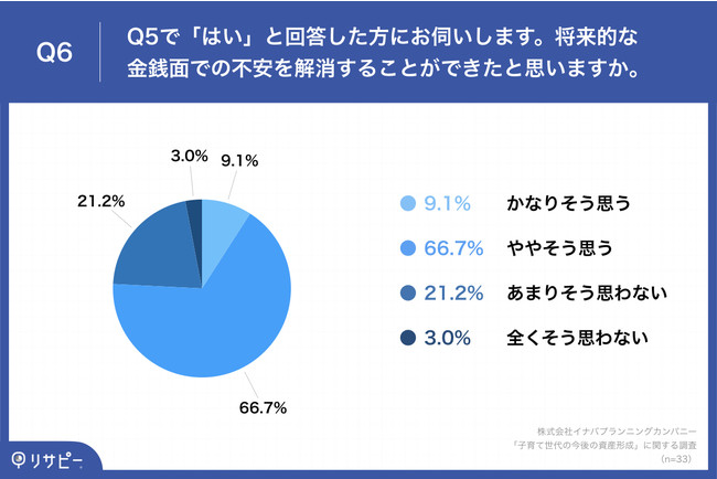 Q5で「はい」と回答した方に、「Q6.将来的な金銭面での不安を解消することができたと思いますか。」(n=33)と質問したところ、「かなりそう思う」が9.1%、「ややそう思う」が66.7%という回答となりました。