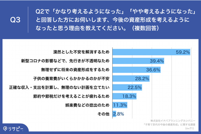 Q2で「かなり考えるようになった」「やや考えるようになった」と回答した方に、「Q3.今後の資産形成を考えるようになったと思う理由を教えてください。(複数回答)」(n=71)と質問したところ、「漠然とした不安を解消するため」が59.2%、「新型コロナの影響などで、先行きが不透明なため」が39.4%、「無理せずに将来の資産形成をするため」が36.6%という回答となりました。