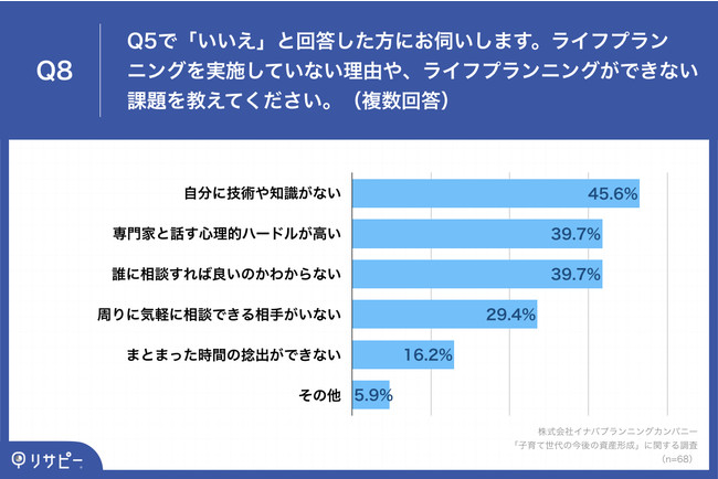 Q5で「いいえ」と回答した方に、「Q8.ライフプランニングを実施していない理由や、ライフプランニングができない課題を教えてください。(複数回答)」(n=68)と質問したところ、「自分に技術や知識がない」が45.6%、「専門家と話す心理的ハードルが高い」が39.7%、「誰に相談すれば良いのかわからない」が39.7%という回答となりました。