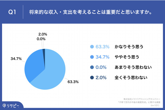 「Q1.将来的な収入・支出を考えることは重要だと思いますか。」(n=101)と質問したところ、「かなりそう思う」が63.3%、「ややそう思う」が34.7%という回答となりました。