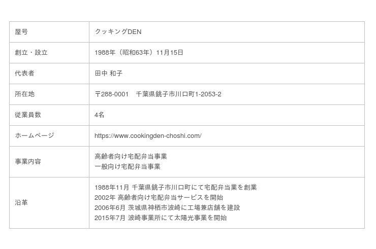 『クッキングDEN』は、1988年11月に、お弁当宅配サービス事業として開業、地域の企業様や一般の方へお弁当を届けてまいりました。そして2002年には、時代の流れとともに高齢者向け宅配弁当サービスを開始、自治体や病院と連携しております。