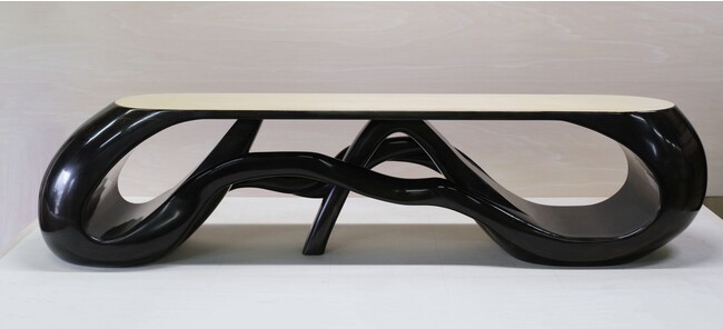 感性のままに作り上げた唯一無二のベンチ。木製でありながらも複雑な形は、美しく優雅でありながらも、機能的な佇まいが特徴です。