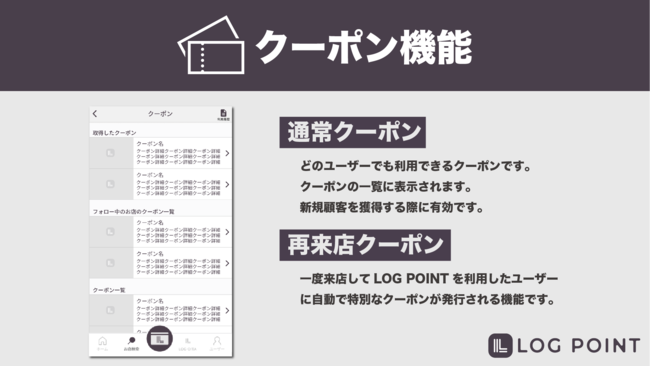 再来店クーポンとは一度来店されたお客様に向けて、予め決めてあるクーポンを自動的にプッシュ通知で送ることができるクーポンです。