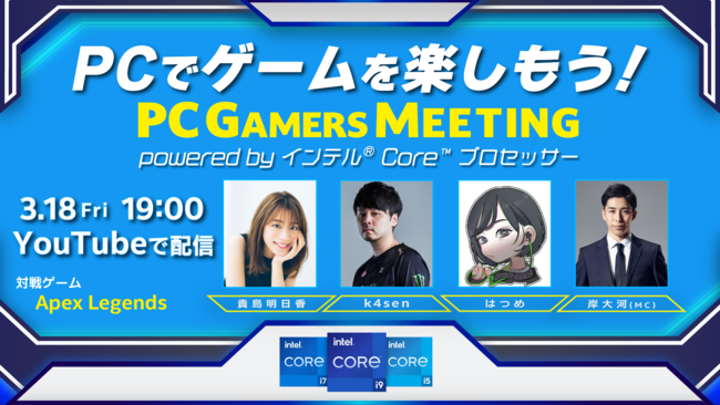 インテル(R) Core(TM) プロセッサー イベント・キャンペーン事務局(主催:旭エレクトロニクス株式会社、岡谷エレクトロニクス株式会社、テックウインド株式会社、菱洋エレクトロ株式会社)は、PCでゲームを楽しむ視聴者参加型のオンラインイベント「PCでゲームを楽しもう!PC Gamers Meeting powered by インテル(R) Core(TM) プロセッサー」を3月18日(金)19:00より開催いたします。