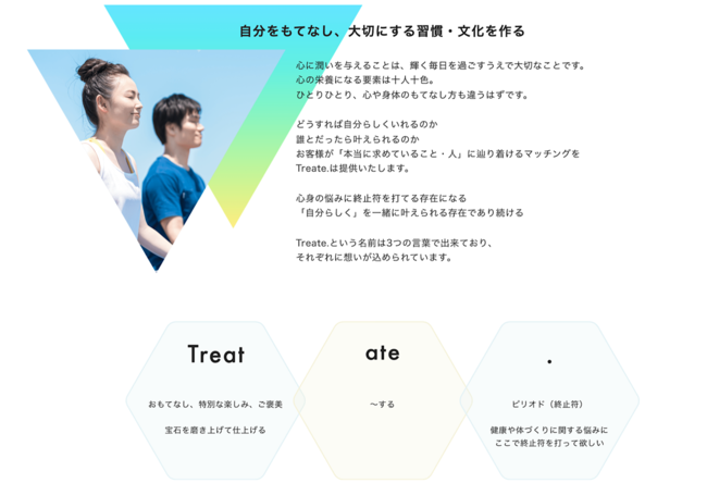 「Treate.」は自分という宝石を磨き上げていくという意味と、健康や体づくりに関する悩みにここで終止符を持って欲しいという意味を込めたピリオドを打っています。