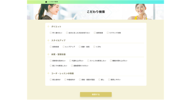 特有のお悩みや目的から検索し、解決できるレッスン・コーチに辿り着けるシステムを用意しました。