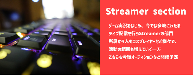 Streamer sectionでは、ゲーム実況者やコスプレイヤーなど様々な個性をもったインフルエンサーが所属していく予定です。