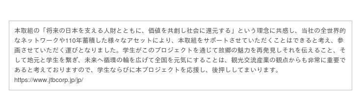 学生の学びと実践を支える【先輩企業】として8社(ジェイ・エス・ビー、JTB、地主、船場、丹青社、八十二銀行、コクヨ、デロイト デジタル)のサポーターが決定