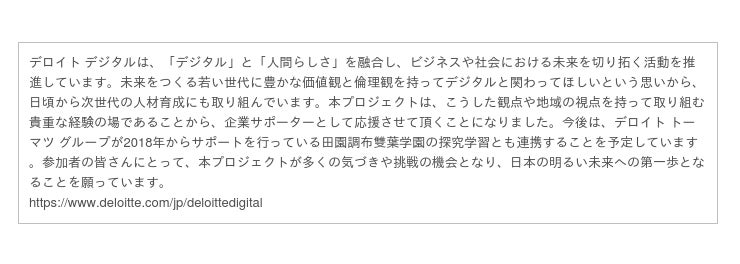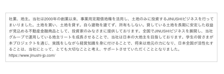 学生にとって「先輩企業」である企業サポーターをはじめ、今後地方自治体や個人などの力を借りながら、社会全体で、日本の未来をつくる人材を育てていきたいと考えています。