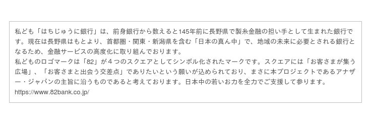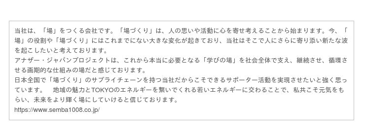 特典: ‐ 店舗内へ企業名・ロゴの掲示 ‐ Webサイト、イベント、活動報告書における企業名・ロゴの掲示、紹介 ‐ アナザー・ジャパンとのコラボレーション企画の実施