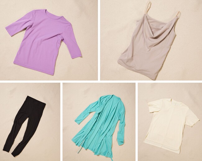 「Cell Solution」は、FSC(適切な森林管理を認証する国際的な制度)認証のユーカリの木を原料とした天然由来の新繊維です。糸の製造過程で美容成分のビタミンE(整肌作用)を配合しており、肌着として着用すると生地と肌の摩擦によってビタミンEが放出され、肌を潤し、紫外線で傷んだ肌や乾燥肌を保湿ケアしてくれる繊維です。