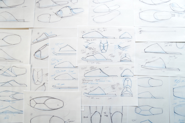 いざスリッパをつくろうと思い立っても、その道のりは簡単なものではありませんでした。まずはとにかく既存のスリッパを分解して、構造を理解するところから始めました。そしてたくさんのアイデアスケッチの中から試作検証を繰り返し、理想の機能・形状を追求しました。