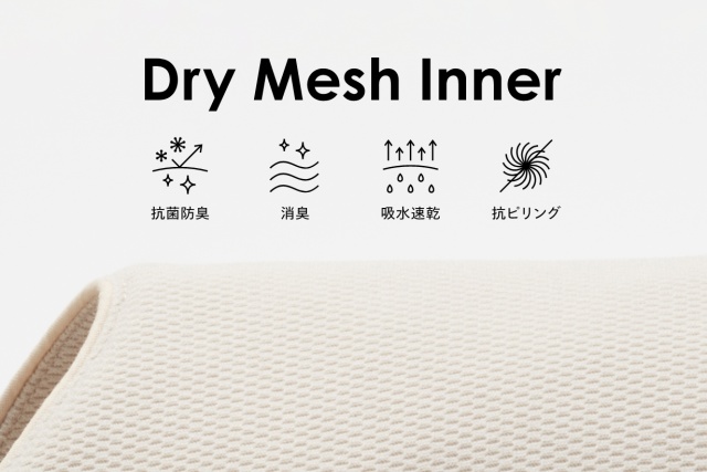 季節や日々の状況にあわせてインナーを組み替えることで、一年中快適に過ごせます。まずはマスクなどに使用されるメッシュ状の高機能生地「ドライメッシュインナー」から。ソフトな肌触りと抗菌防臭、消臭、吸収速乾、抗ピリングなど多機能なインナーで、オールシーズン対応、特に春夏におすすめです。