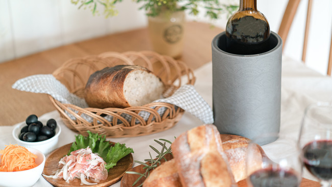 瓦の特性を活かしたボトルキーパー悠久。気化熱保冷だけでなく結露吸収もお食事シーンには嬉しいポイント!