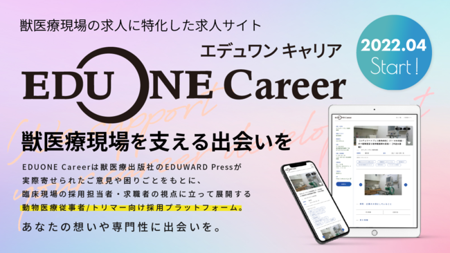株式会社EDUWARD Press(本社:東京都町田市 代表:坂本 佳弘)は、2022年4月に獣医師・動物看護師をはじめとした獣医療従事者および、トリマー、受付、事務職等の求人情報を取り扱う求人・採用プラットフォーム「EDUONE Career(エデュワンキャリア)」を開設いたしました。