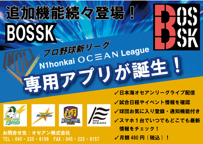 オセアン株式会社(本社:神奈川県横浜市 代表取締役社長:黒田)は、2022年4月2日(土)に開幕するプロ野球新リーグ「日本海オセアンリーグ」に向け、公式戦ライブ配信やチケット購入、イベント情報をお届けする配信アプリ【BOSSK】をリリース致しました。