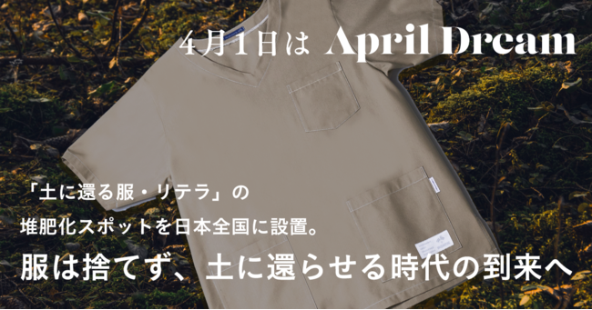 株式会社ツカモトコーポレーション(本社:東京都中央区、代表取締役社長:百瀬二郎)は、「April Dream 4月1日は、夢の日。」に参加しています。このプレスリリースは「株式会社ツカモトコーポレーション」のApril Dream(=目指したい夢)として、土に還る服・リテラが日本中で使われ、服がゴミにならない時代が到来した未来のニュースを綴っています。