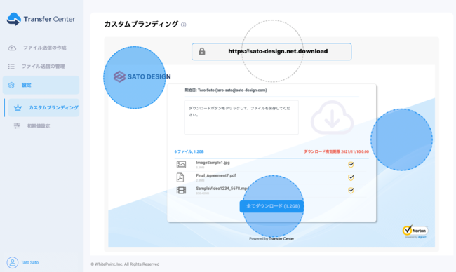 Transfer Centerでは、ファイル送信時に生成されるURLに「屋号」や「個人名」「ビジネス名」などを反映できます。たとえば、ビジネス名が「佐藤」の場合、「sato.net.download」というダウンロードリンクが作成可能に。クリックすれば、事前に作成したオリジナルのロゴ入りダウンロードページが表示されるため、取引先にご自身のことを印象付けることができます。