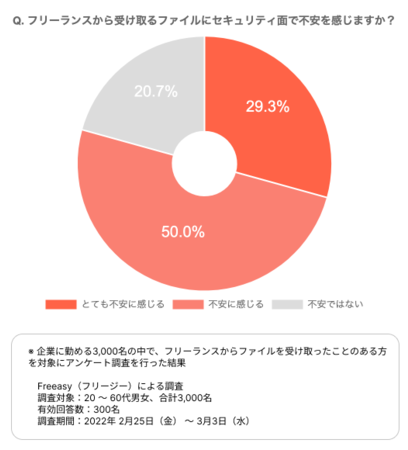 実際に、当社が企業に勤める3000名を対象に実施したアンケート調査によると、フリーランスからファイルを受け取ったことのある人のうち、実に約80%が不安やリスクを感じていることが明らかになりました。この結果から、今はフリーランスにも高いセキュリティ意識が求められる時代であるといえます。