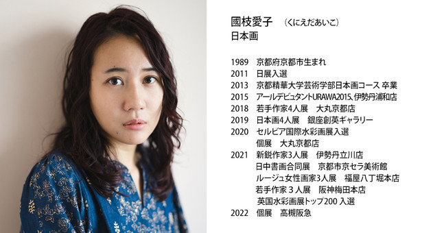 京都在住の日本画家。日本画で素朴な自然描写の中に独自の色彩と心象とが融合した作風。夜景作品にも好評を博しています。風景を通して内面の心象を表現。洋画のように塗り重ね、色相で魅せる作風で夕陽や水面、木漏れ日などゆらぎや移ろいというテーマに挑み続け、近年は滝やうさぎ、こもれびシリーズなどの幅の広い作品制作に力を入れています。