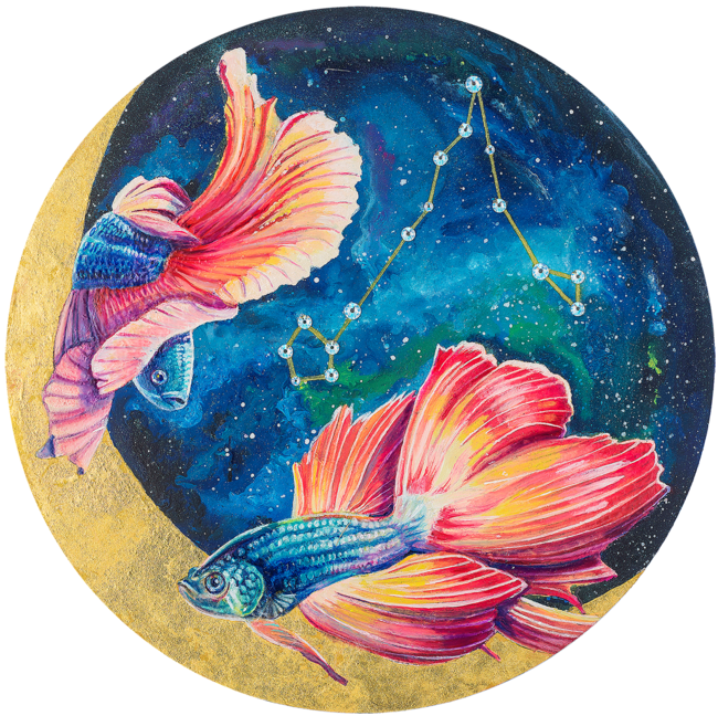 スピリチュアルの世界を描くアーティスト。ミクストメディア技法(混合技法)で縁起物を描き、西洋占星術の豊富な知識と現代的な感性でスタイリッシュな作品を展開しています。煌びやかな画材を巧みに使い、神秘の世界を本人が分かりやすく説明してくれます。題材の言葉遊びはシュールレアリズムの影響を受けた作家とも言えます。